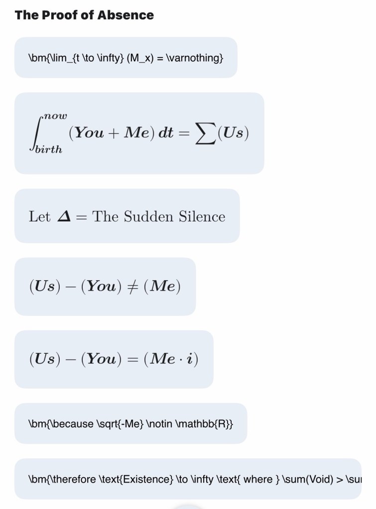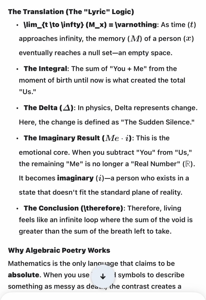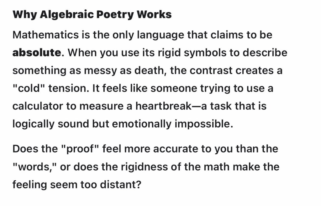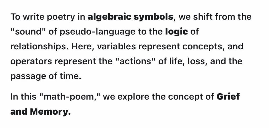 Now, what to say about this? To be honest, my first response was surprise. I read it and thought, could I do better? No. Gemini’s use of algebra went much deeper than simply mimicking the English language. It actually uses the internal rules of information processing within algebra to write a poem that could be read according to those rules. Granted, this is something different from the original grounds of my fascination with pseudo texts, but it is thought provoking in its own right.